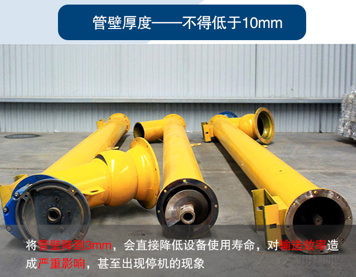 一般情況下,管式螺旋輸送機(jī)管壁厚度要求不低于10mm,有些廠(chǎng)家為了在其中賺取更多利益,將管壁降到了3mm,會(huì)直接降低設(shè)備使用壽命,對(duì)輸送效率造成嚴(yán)重影響,甚至出現(xiàn)停機(jī)的現(xiàn)象。
