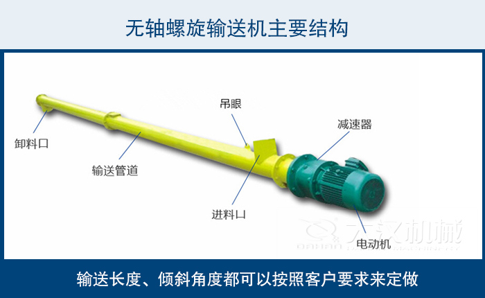 驅動、殼體、襯板、葉片、 支架、蓋板、進料口、出料口,輸送長度、傾斜角度都可以按照客戶要求來定做,不同物料不同輸送角度我們為您合理選型!