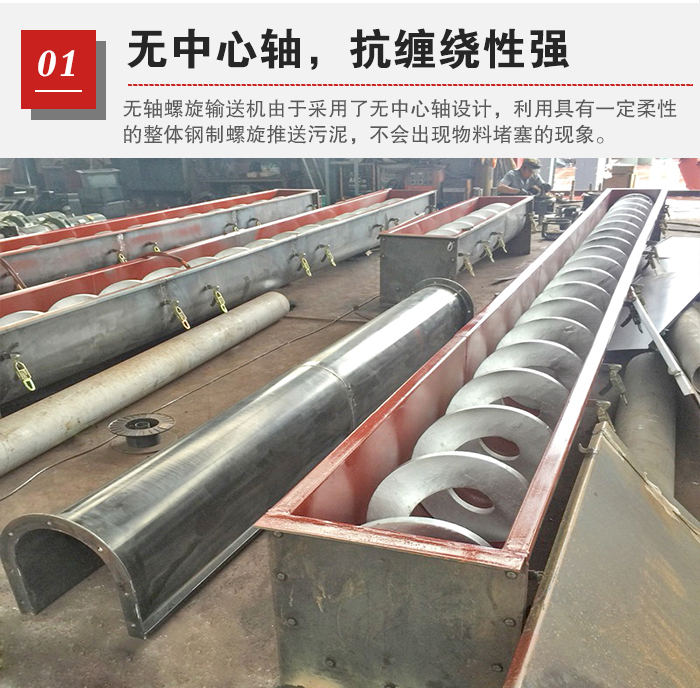 污泥中含有大量的雜質,使用傳統輸送機對其進行輸送很容易出現堵料現象,嚴重影響輸送效率,無軸螺旋輸送機由于采用了無中心軸設計,利用具有一定柔性的整體鋼制螺旋推送污泥,其抗纏繞性強,不會出現物料堵塞的現象。