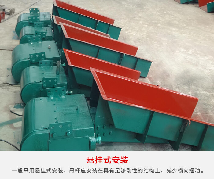 電磁振動(dòng)給料機(jī)一般采用懸掛式安裝,吊桿應(yīng)安裝在具有足夠剛性的結(jié)構(gòu)上, 為了減少電磁振動(dòng)給料機(jī)的橫向擺動(dòng), 懸掛吊桿應(yīng)向外張開 10°左右布置。對(duì)于大型給料機(jī), 為了維修和更換料槽方便,還應(yīng)設(shè)置移動(dòng)滑架。