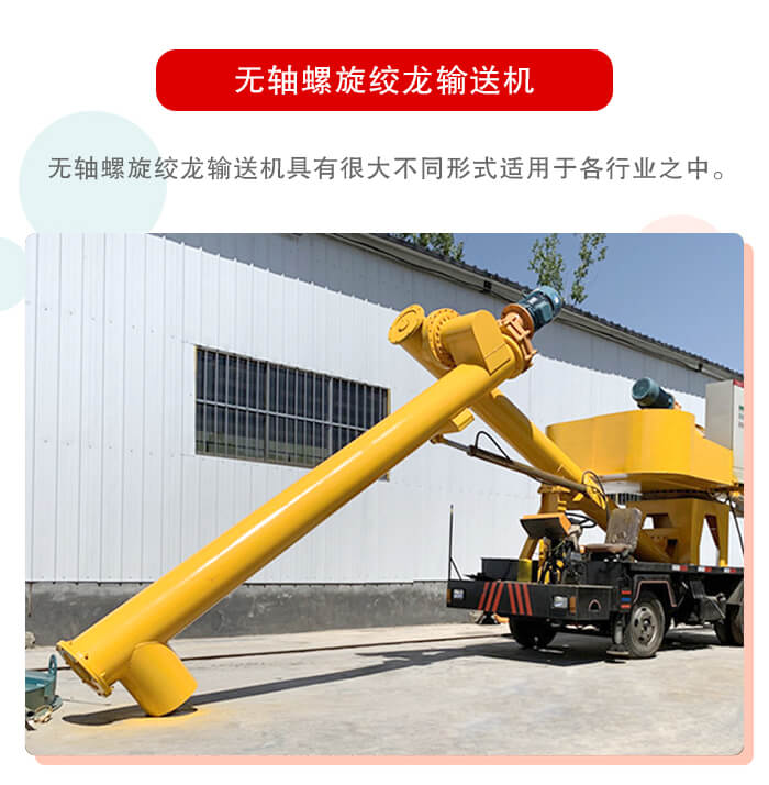 無(wú)軸螺旋絞龍輸送機(jī)其也是有管式螺旋輸送輸送機(jī)組成,所以其除進(jìn)出料口敞開(kāi)外,其余部分均可加蓋封閉,物料不會(huì)外溢,減少空氣污染。