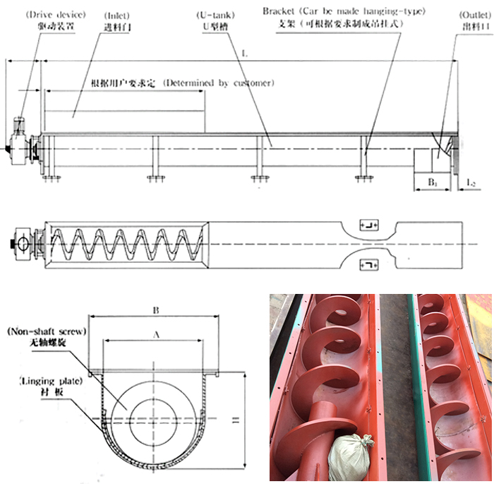 無(wú)軸螺旋絞龍輸送機(jī)由無(wú)軸螺旋、U型槽、襯板、蓋板、進(jìn)出口和驅(qū)動(dòng)裝置組成。