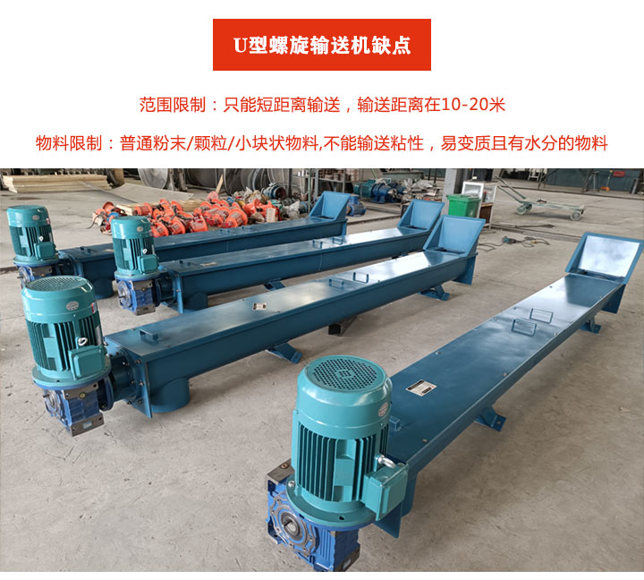 輸送范圍限制:U型螺旋輸送機只適合短距離輸送作業(yè),其輸送距離在10-20米,且輸送傾角不能超過15°;如果長距離輸送物料,會把易碎物料擠壓破壞,不能確保物料完整性。